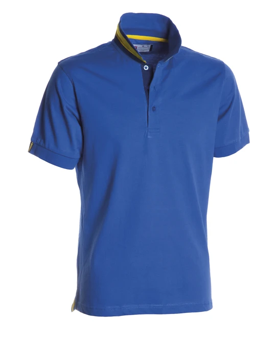 Men’s short-sleeved polo shirt with 3, matching, mother-of-pearl effect buttons, matching collar with contrasting colour underside; contrasting inner button flap and side vents, right sleeve edging with colour trim (same colour as collar), rib sleeve edging, concealed collar stitching with contrasting tape, side reinforcement tape, inner