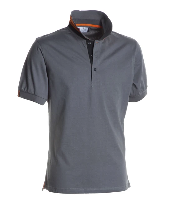 Men’s short-sleeved polo shirt with 3, matching, mother-of-pearl effect buttons, matching collar with contrasting colour underside; contrasting inner button flap and side vents, right sleeve edging with colour trim (same colour as collar), rib sleeve edging, concealed collar stitching with contrasting tape, side reinforcement tape, inner