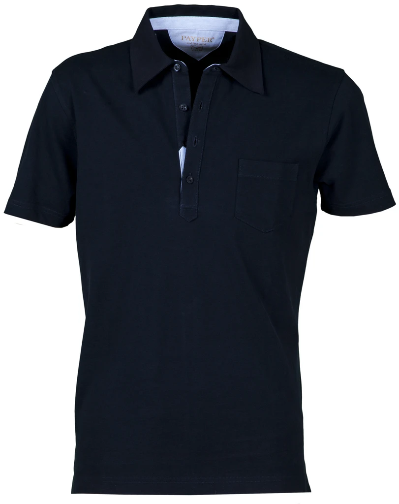 Men’s short-sleeved polo shirt with 4, matching, mother-of-pearl effect buttons, shirt-style pique collar, pocket and light blue poplin inserts on the inside collar, opening and side vents, transfer label, inner neck tape