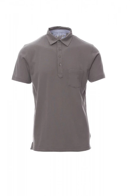 Men’s short-sleeved polo shirt with 4, matching, mother-of-pearl effect buttons, shirt-style pique collar, pocket and light blue poplin inserts on the inside collar, opening and side vents, transfer label, inner neck tape