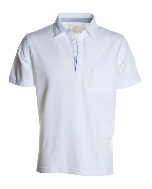 Men’s short-sleeved polo shirt with 4, matching, mother-of-pearl effect buttons, shirt-style pique collar, pocket and light blue poplin inserts on the inside collar, opening and side vents, transfer label, inner neck tape