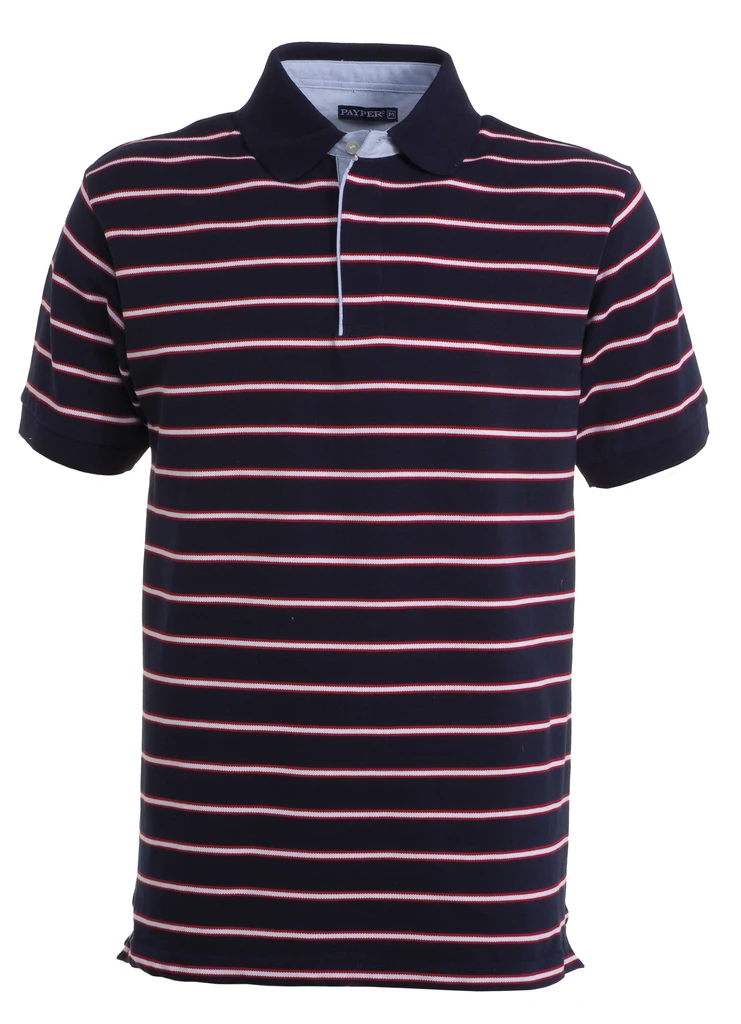 Striped, short-sleeved polo shirt with 3 white buttons, button flap, inside collar and side vents in Oxford blue, rib collar and sleeve edging