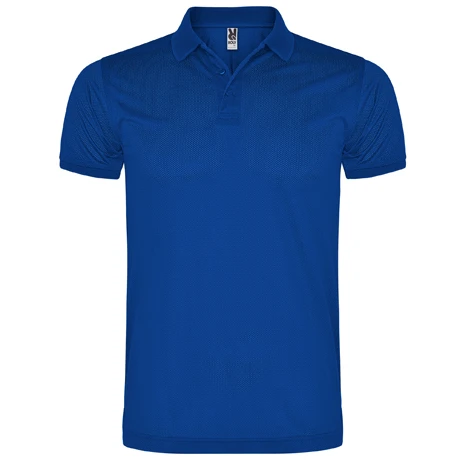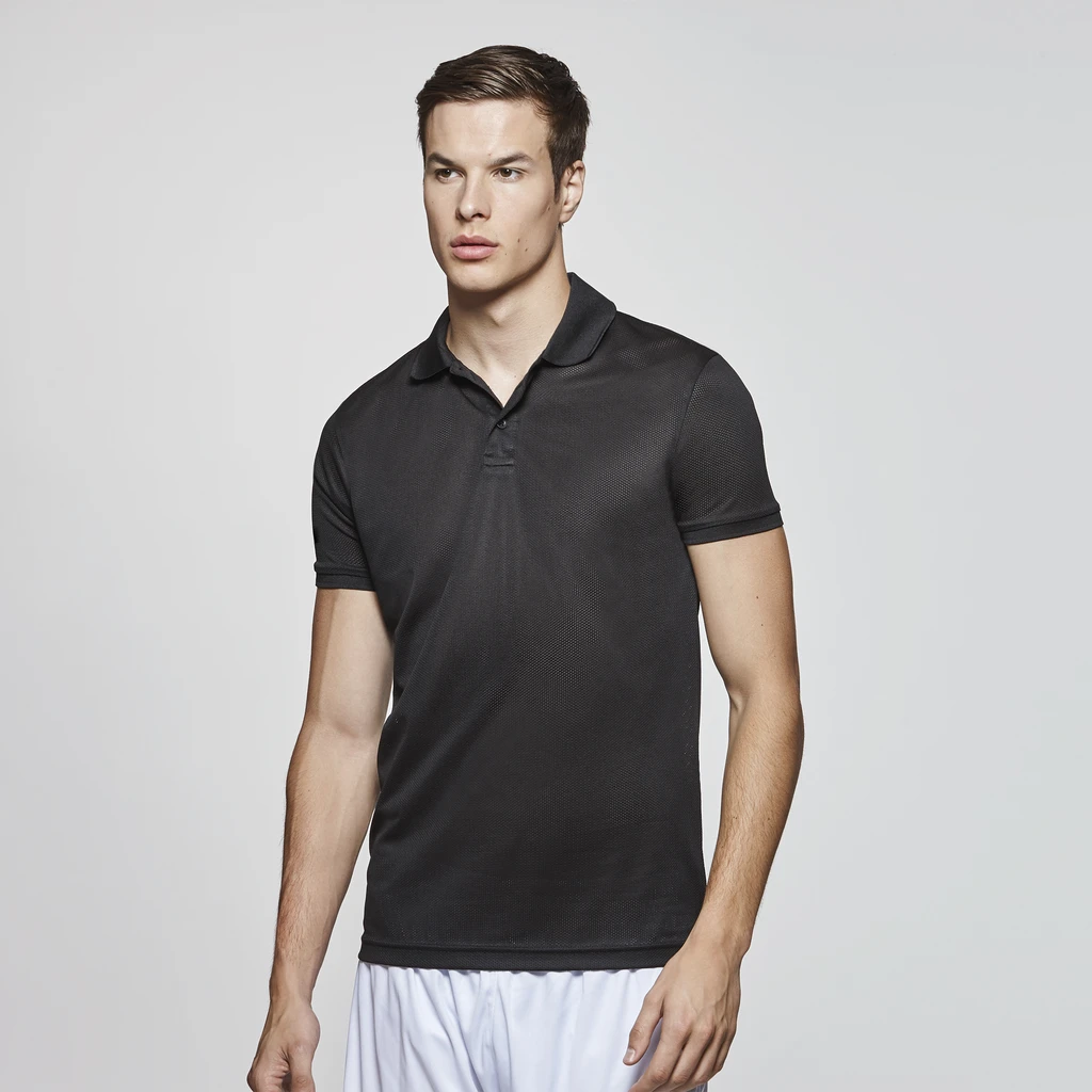 Polo shirt in technical microperforated fabric with 1x1 knitted collar, button placket and covered seams. Short sleeve ribbed end and bottom hem with reinforced covered side slits.