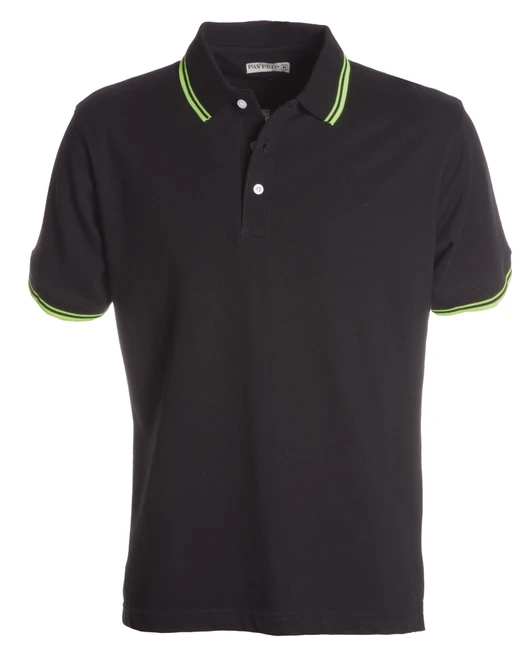 Men’s short-sleeved polo shirt with 3 white buttons, fine contrasting collar and sleeve trim, rib collar and sleeve edging, side vents with reinforced seams, concealed collar stitching, side reinforcement tape, stretch seams, inner neck tape