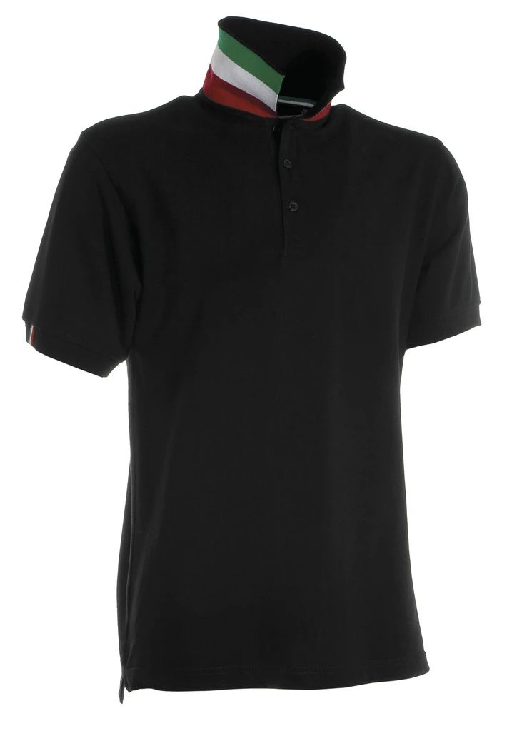 Men’s short-sleeved polo shirt with 3, matching, mother-of-pearl effect buttons, matching collar with contrasting underside (colours of the flag). Right sleeve edging with colour trim (same colour as collar), rib collar and sleeve edging, side vent trim with colours of the flag, concealed collar stitching with jersey tape (colours of the flag), side reinforcement tape, inner neck tape