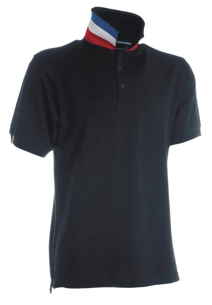 Men’s short-sleeved polo shirt with 3, matching, mother-of-pearl effect buttons, matching collar with contrasting underside (colours of the flag). Right sleeve edging with colour trim (same colour as collar), rib collar and sleeve edging, side vent trim with colours of the flag, concealed collar stitching with jersey tape (colours of the flag), side reinforcement tape, inner neck tape