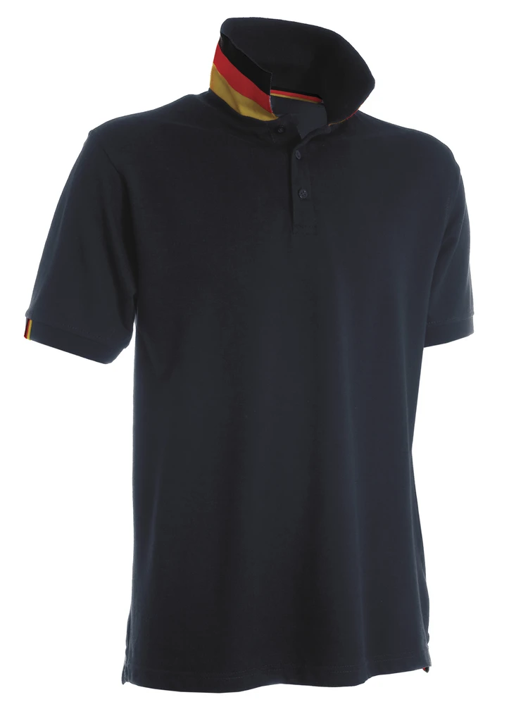 Men’s short-sleeved polo shirt with 3, matching, mother-of-pearl effect buttons, matching collar with contrasting underside (colours of the flag). Right sleeve edging with colour trim (same colour as collar), rib collar and sleeve edging, side vent trim with colours of the flag, concealed collar stitching with jersey tape (colours of the flag), side reinforcement tape, inner neck tape