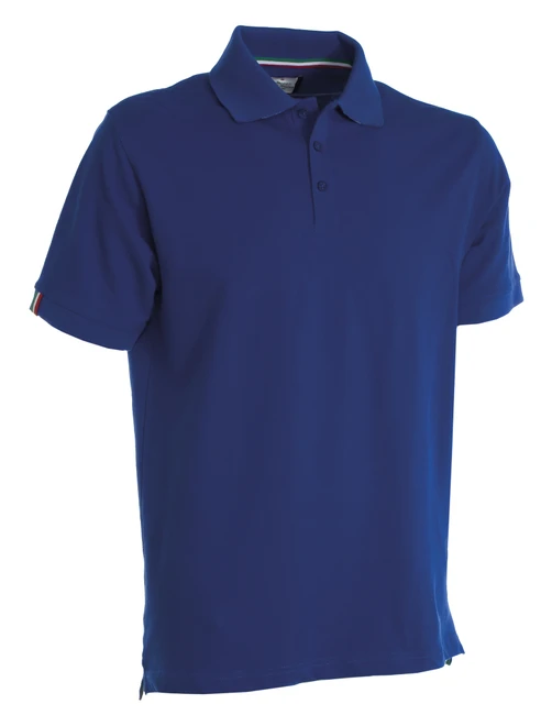 Men’s short-sleeved polo shirt with 3, matching, mother-of-pearl effect buttons, matching collar with contrasting underside (colours of the flag). Right sleeve edging with colour trim (same colour as collar), rib collar and sleeve edging, side vent trim with colours of the flag, concealed collar stitching with jersey tape (colours of the flag), side reinforcement tape, inner neck tape