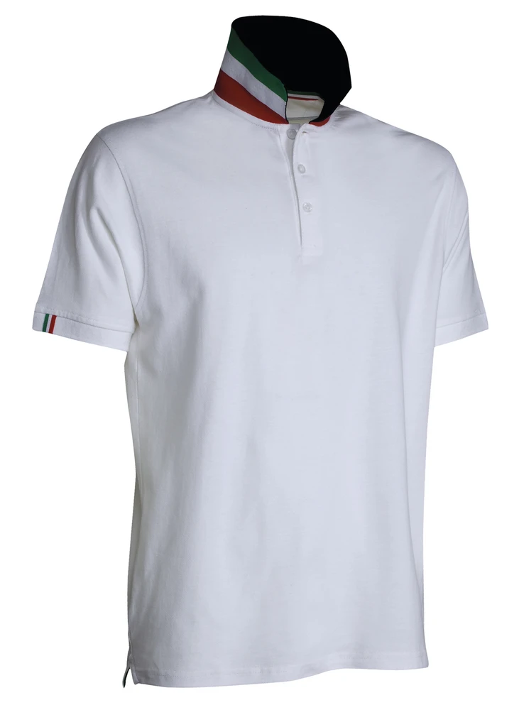 Men’s short-sleeved polo shirt with 3, matching, mother-of-pearl effect buttons, matching collar with contrasting underside (colours of the flag). Right sleeve edging with colour trim (same colour as collar), rib collar and sleeve edging, side vent trim with colours of the flag, concealed collar stitching with jersey tape (colours of the flag), side reinforcement tape, inner neck tape