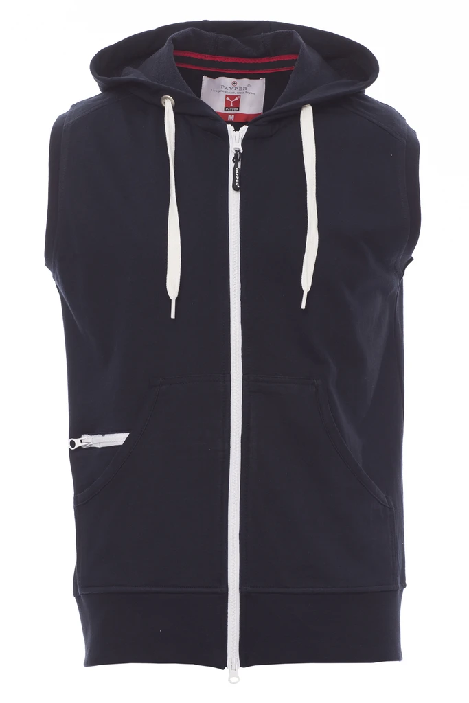 Men's sleeveless hoodie, full plastic zip in contrasting colour with double metal pull, shaped hood and drawstring in contrasting colour, kangaroo pocket with small zip pocket
