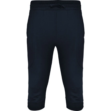 Men sport bermuda with wide adjustable elastic waistband with drawcord, ribbed side pockets and back patch pocket. Elongated side panels with curved shape. Knees with tweezers four corners. Wide cuffs in jersey with difference in height.