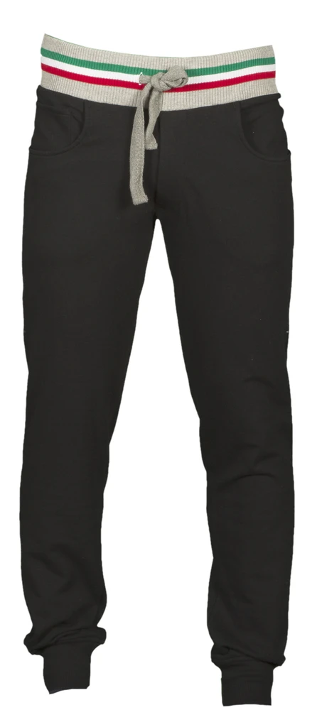All-season sweatpants with stretch rib at the waist and bottom of the leg, drawstring, two front pockets and a small pocket, zip fly fastening