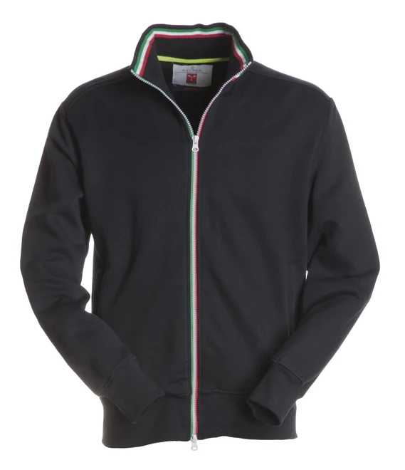 Men’s sweatshirt with full, contrasting three-coloured plastic SBS zip with double metal pull, rib collar with contrasting trim, fitted sleeves, two outer pockets, stretch rib cuffs and hem, reinforced seams