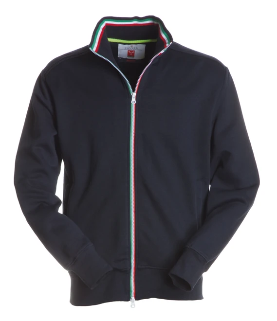 Men’s sweatshirt with full, contrasting three-coloured plastic SBS zip with double metal pull, rib collar with contrasting trim, fitted sleeves, two outer pockets, stretch rib cuffs and hem, reinforced seams
