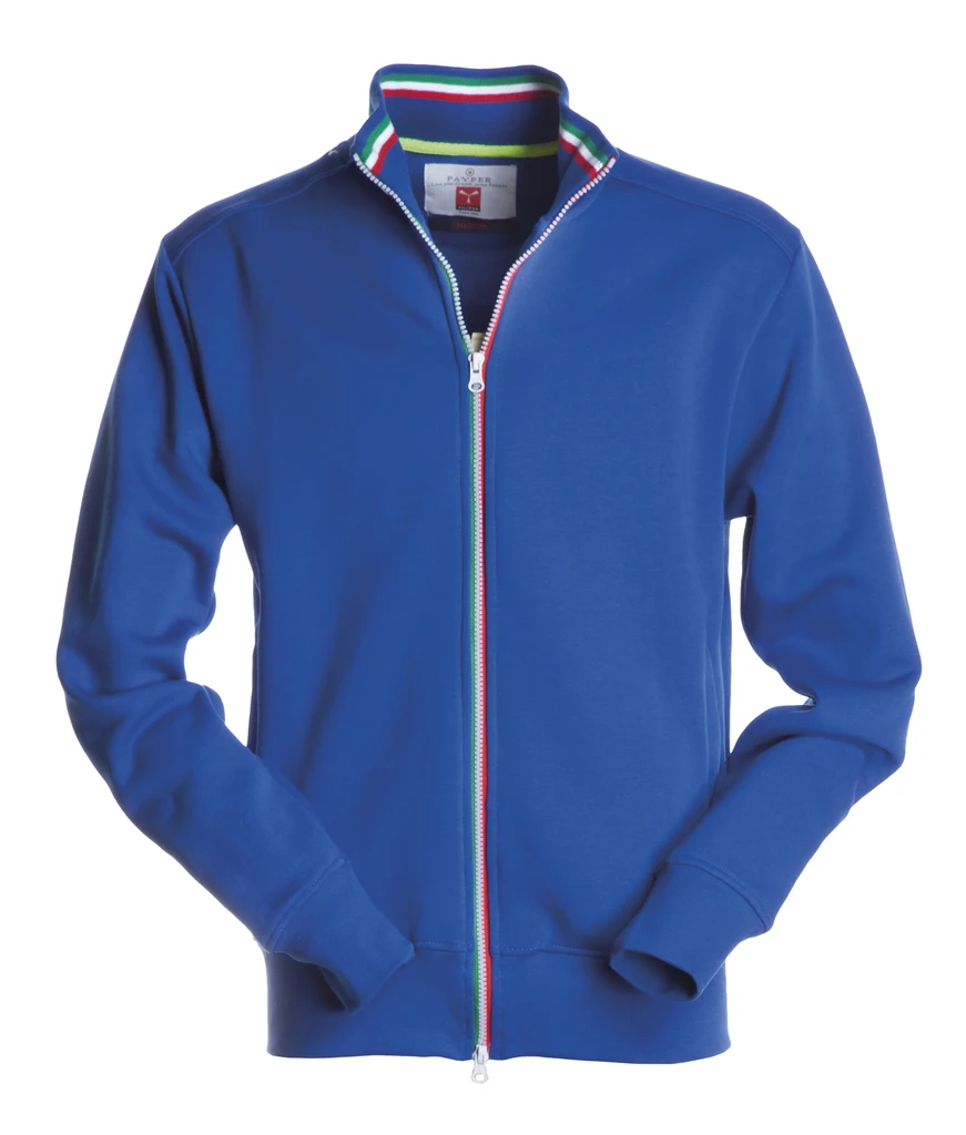 Men’s sweatshirt with full, contrasting three-coloured plastic SBS zip with double metal pull, rib collar with contrasting trim, fitted sleeves, two outer pockets, stretch rib cuffs and hem, reinforced seams