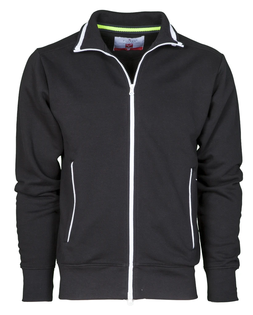 Men’s sweatshirt with full, contrasting coloured plastic SBS zip with double metal pull; rib collar with contrasting trim, side pockets with contrasting trim, fitted sleeves, two outer pockets with contrasting zip, stretch rib cuffs and hem, reinforced seams