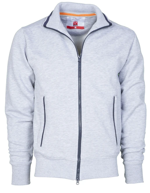 Men’s sweatshirt with full, contrasting coloured plastic SBS zip with double metal pull; rib collar with contrasting trim, side pockets with contrasting trim, fitted sleeves, two outer pockets with contrasting zip, stretch rib cuffs and hem, reinforced seams