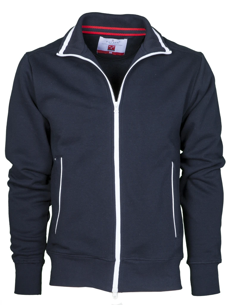 Men’s sweatshirt with full, contrasting coloured plastic SBS zip with double metal pull; rib collar with contrasting trim, side pockets with contrasting trim, fitted sleeves, two outer pockets with contrasting zip, stretch rib cuffs and hem, reinforced seams