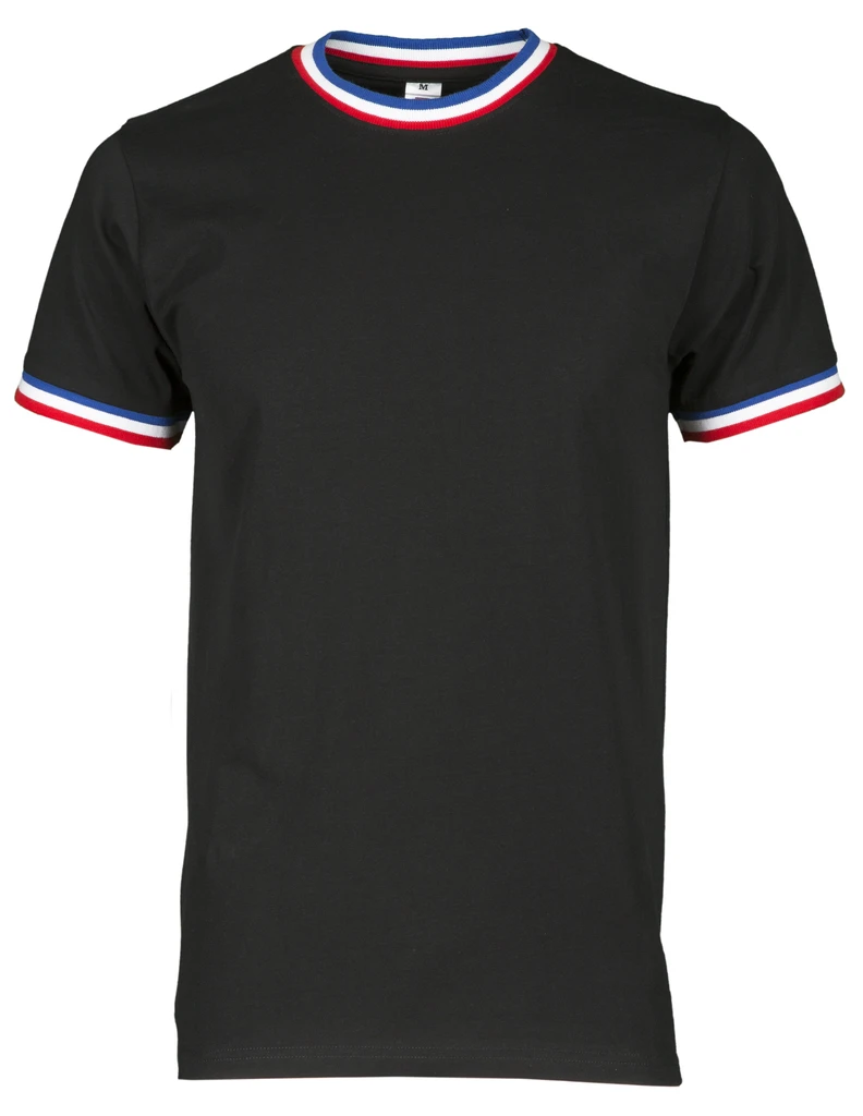 Men’s short-sleeved crew neck t-shirt, contrasting collar and sleeve edging (colours of the flag) 2.3 cm spandex mix rib neckband with top stitching on the front, shoulder-to-shoulder reinforcement tape. Stretch seams, side seams