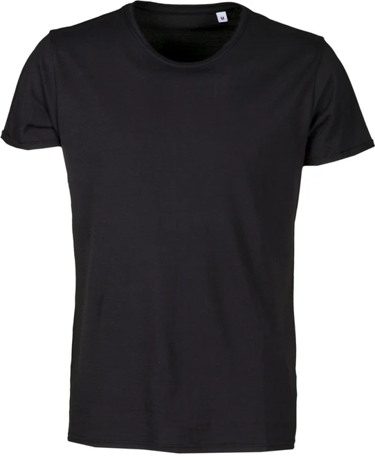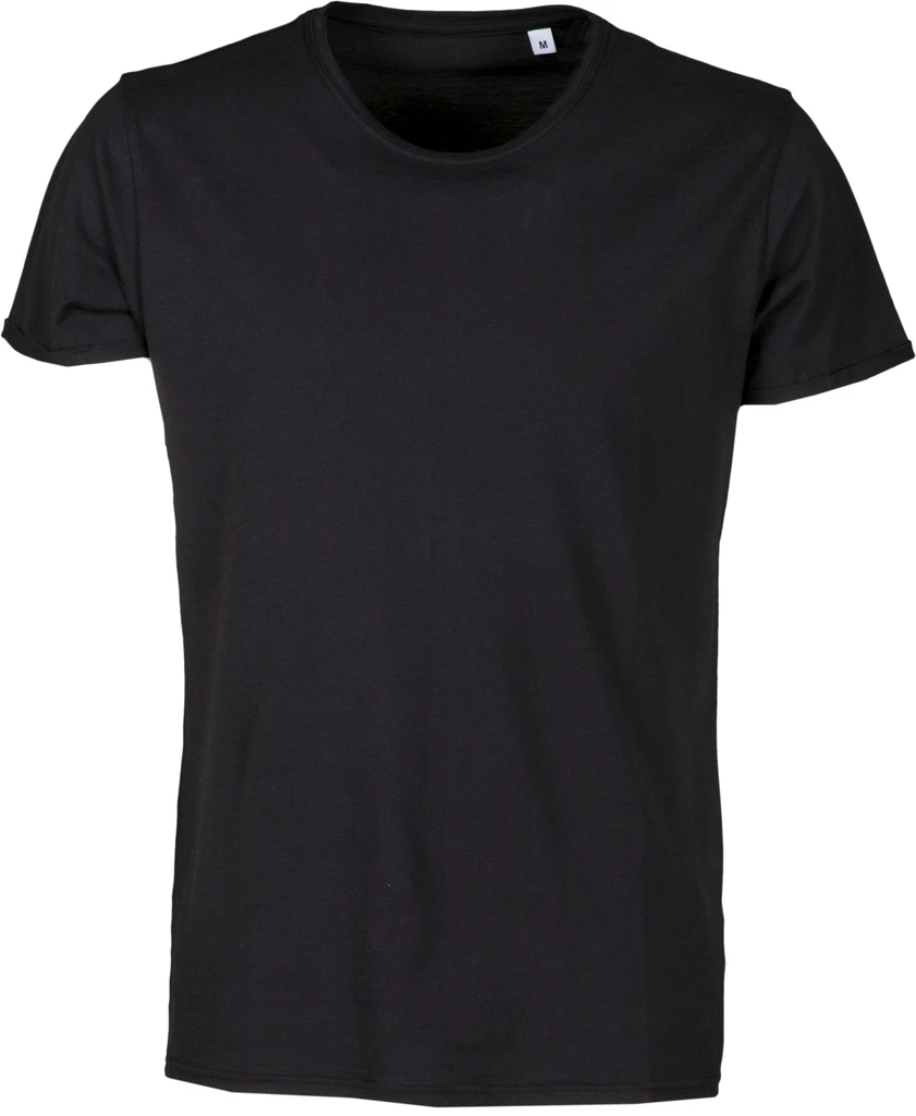 Men’s short-sleeved T-shirt with slightly scooped neck, low 1 cm spandex mix collar, close-fitting shoulders with double stitched seams inside, sleeves with narrow raw finish turn-up, side seams, no label