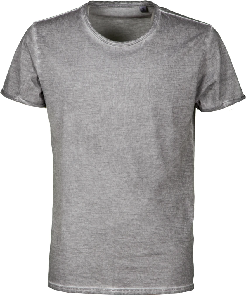 Men’s short-sleeved T-shirt with slightly scooped neck, low 1 cm spandex mix collar, close-fitting shoulders with double stitched seams inside, sleeves with narrow raw finish turn-up, side seams, no label
