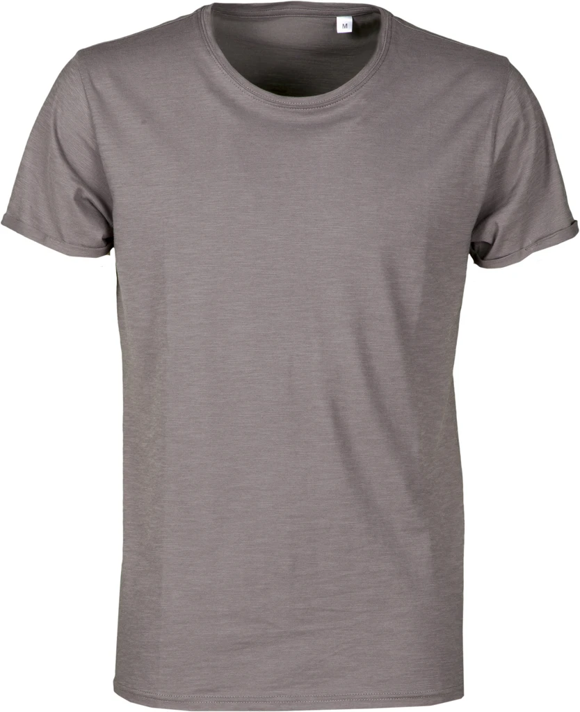 Men’s short-sleeved T-shirt with slightly scooped neck, low 1 cm spandex mix collar, close-fitting shoulders with double stitched seams inside, sleeves with narrow raw finish turn-up, side seams, no label