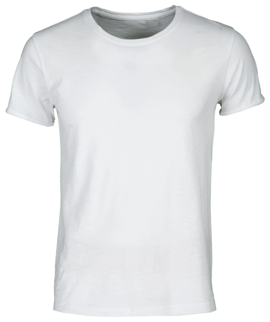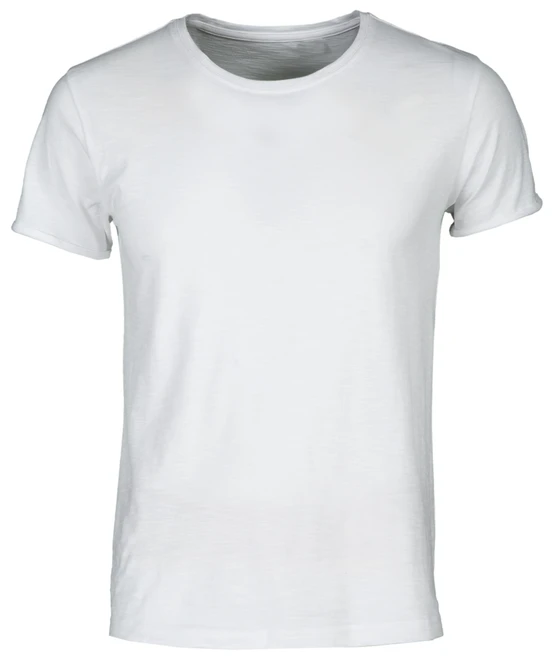 Men’s short-sleeved T-shirt with slightly scooped neck, low 1 cm spandex mix collar, close-fitting shoulders with double stitched seams inside, sleeves with narrow raw finish turn-up, side seams, no label