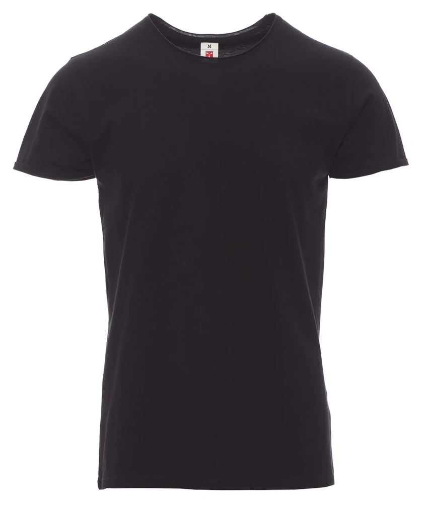 Short-sleeved t-shirt with slightly scooped neck, 1.0 cm hem with unfinished edges, close-fitting shoulders with double stitched internal seams, short and narrow sleeves with unfinished and turned-up edges, side seams, transfer label