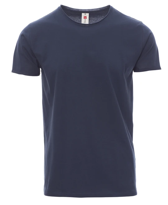 Short-sleeved t-shirt with slightly scooped neck, 1.0 cm hem with unfinished edges, close-fitting shoulders with double stitched internal seams, short and narrow sleeves with unfinished and turned-up edges, side seams, transfer label