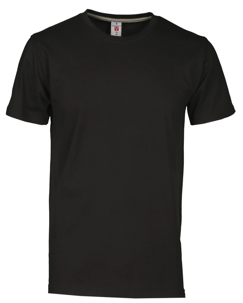 Men’s short-sleeved crew neck t-shirt, with 1.5 cm spandex mix rib neckband with top stitching on the front, contrasting shoulder-to-shoulder reinforcement tape visible on the inside collar, stretch seams, side seams