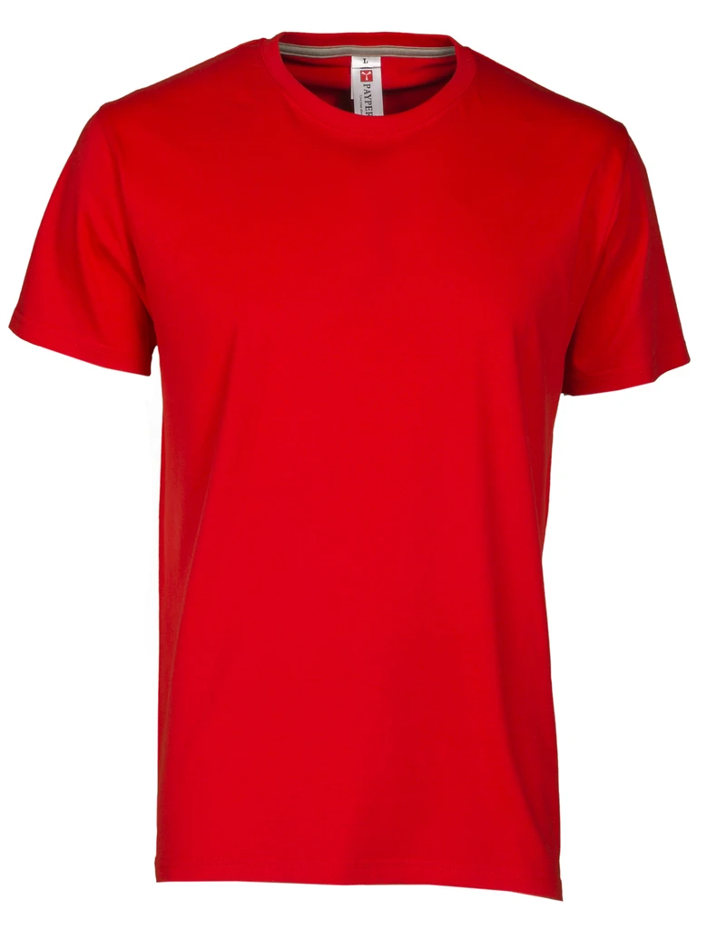 Men’s short-sleeved crew neck t-shirt, with 1.5 cm spandex mix rib neckband with top stitching on the front, contrasting shoulder-to-shoulder reinforcement tape visible on the inside collar, stretch seams, side seams