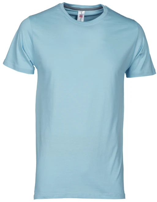 Men’s short-sleeved crew neck t-shirt, with 1.5 cm spandex mix rib neckband with top stitching on the front, contrasting shoulder-to-shoulder reinforcement tape visible on the inside collar, stretch seams, side seams