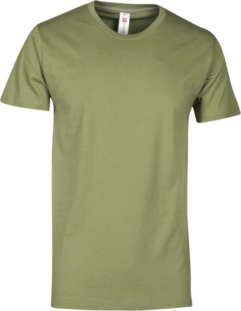 Men’s short-sleeved crew neck t-shirt, with 1.5 cm spandex mix rib neckband with top stitching on the front, contrasting shoulder-to-shoulder reinforcement tape visible on the inside collar, stretch seams, tubular design (camouflage version with side seams)
