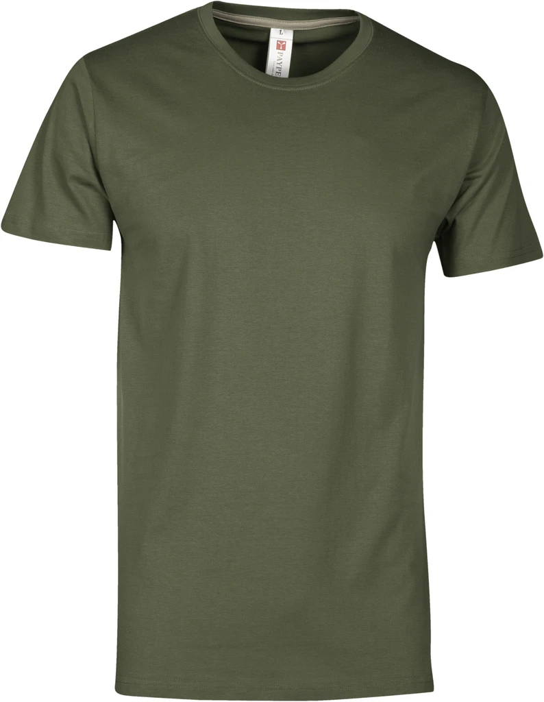 Men’s short-sleeved crew neck t-shirt, with 1.5 cm spandex mix rib neckband with top stitching on the front, contrasting shoulder-to-shoulder reinforcement tape visible on the inside collar, stretch seams, tubular design (camouflage version with side seams)