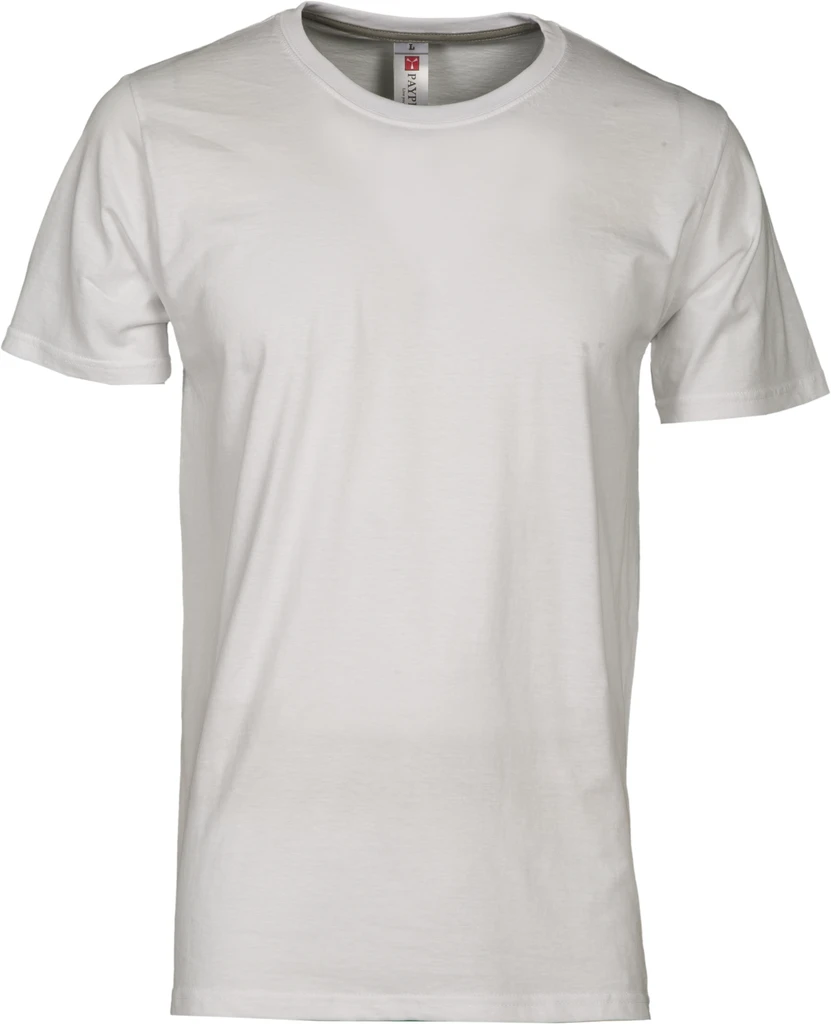 Men’s short-sleeved crew neck t-shirt, with 1.5 cm spandex mix rib neckband with top stitching on the front, contrasting shoulder-to-shoulder reinforcement tape visible on the inside collar, stretch seams, tubular design (camouflage version with side seams)