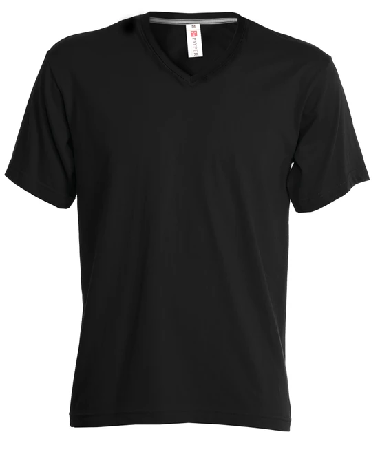 Men’s short-sleeved V neck t-shirt, with 1.5 cm spandex mix rib neckband with top stitching on the front, contrasting shoulder-to-shoulder reinforcement tape visible on the inside collar, stretch seams, tubular design