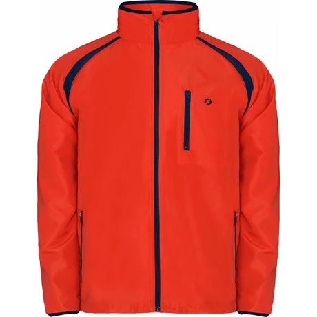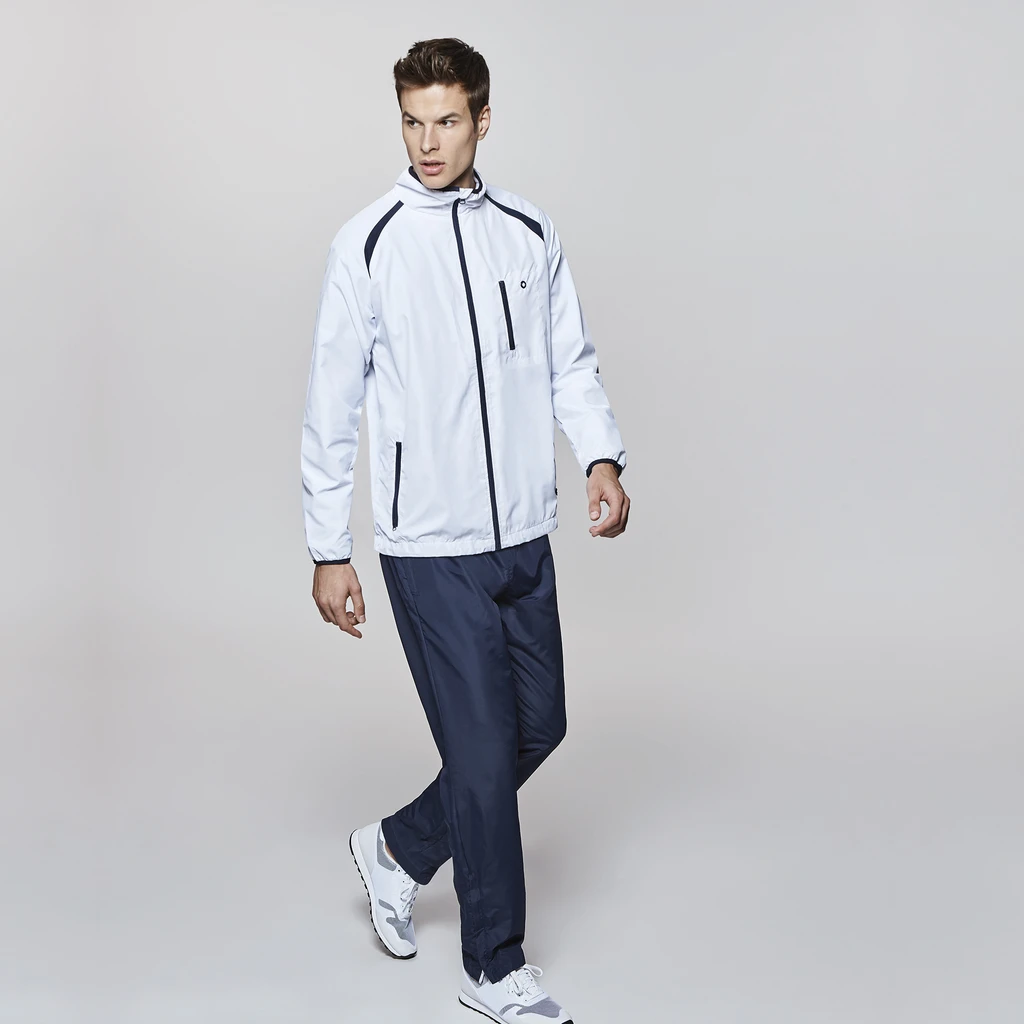 Tracksuit for man combined with jacket and pants. Pocket in chest with eyelet for cable exit of mobile devices. Pockets with zipper to contrast. Fasteners with terminals in elastic hem. Full inner mesh lining. Pants with sides pockets, elastic waistband and adjustable drawcord in contrast. Zipper on bottom leg.