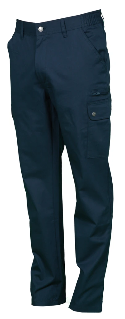 Men’s all-season stretch trousers with side elastic and waist belt loops, zip fastening with metal button, two classic front pockets, two large side pockets with flaps and snap fasteners, one left pocket with zip, one foldaway tape measure pocket on the right, two slit back pockets with button and buttonhole