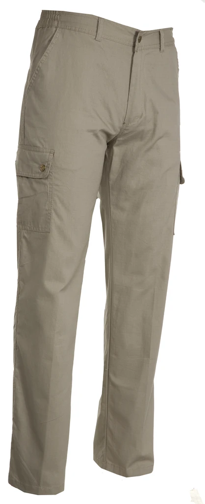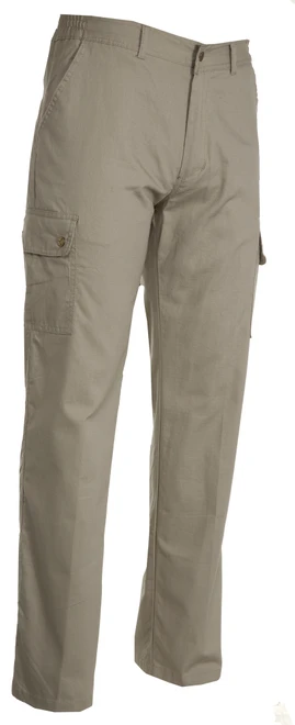 Men’s summer trousers with side elastic and waist belt loops. Zip fastening with metal button, two front pockets, two side pockets with flaps and snap fasteners, one left zip pocket, one foldaway tape measure pocket on the right, two slit back pockets with button and buttonhole