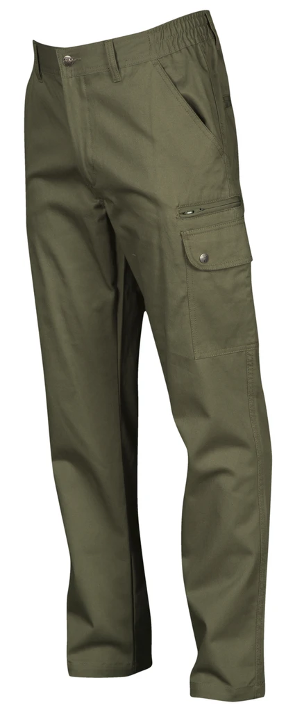 Men’s all-season trousers with side elastic and waist belt loops. Zip fastening with metal button, two front pockets, two side pockets with flaps and snap fasteners, one left zip pocket, one foldaway tape measure pocket on the right, two slit back pockets with button and buttonhole