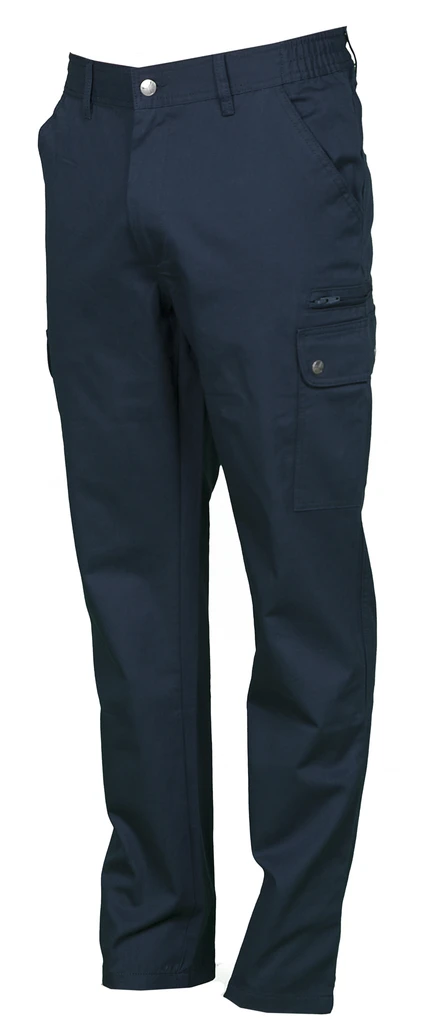 Men’s all-season trousers with side elastic and waist belt loops. Zip fastening with metal button, two front pockets, two side pockets with flaps and snap fasteners, one left zip pocket, one foldaway tape measure pocket on the right, two slit back pockets with button and buttonhole