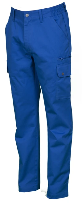 Men’s all-season trousers with side elastic and waist belt loops. Zip fastening with metal button, two front pockets, two side pockets with flaps and snap fasteners, one left zip pocket, one foldaway tape measure pocket on the right, two slit back pockets with button and buttonhole