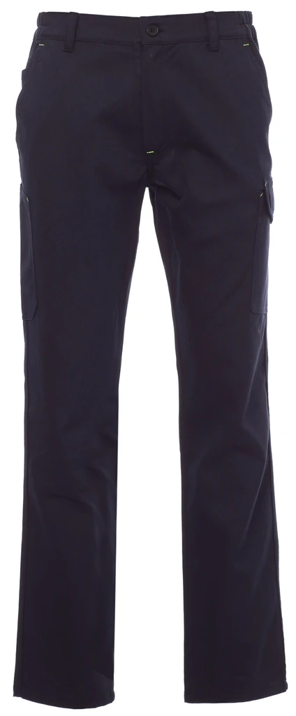 Trousers with belt loops and elastic waist, zip and button closure. Double seams on the crotch and inside leg, two classic front pockets, one coin pocket, one right side tape measure pocket, one left side pocket with LOCK SYSTEM flap closure, two back pockets, one with flap and Velcro