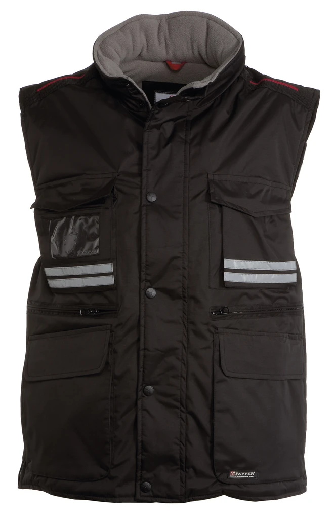 Men’s vest, 8 mm plastic zip with metal pull, with flap fastening and plastic buttons, detachable and/or foldaway shaped hood, grey reflective stripes on the front and back, side vent with gusset and zip, nine outer pockets, two with LOCK SYSTEM, two with zip and reinforced inner, one with a reversible badge holder. Padded, collar, back and lower back warmer in micro-fleece, inner drawstring and zip for easier printing and embroidery