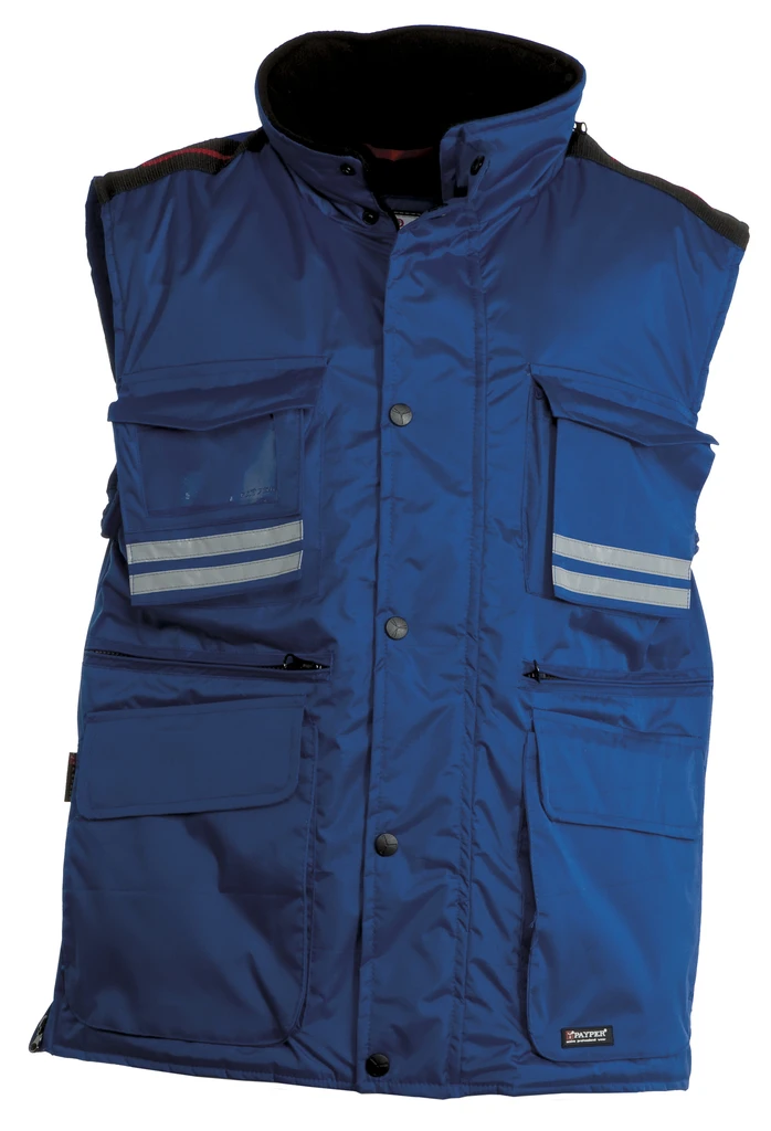 Men’s vest, 8 mm plastic zip with metal pull, with flap fastening and plastic buttons, detachable and/or foldaway shaped hood, grey reflective stripes on the front and back, side vent with gusset and zip, nine outer pockets, two with LOCK SYSTEM, two with zip and reinforced inner, one with a reversible badge holder. Padded, collar, back and lower back warmer in micro-fleece, inner drawstring and zip for easier printing and embroidery