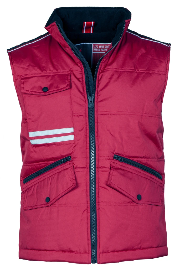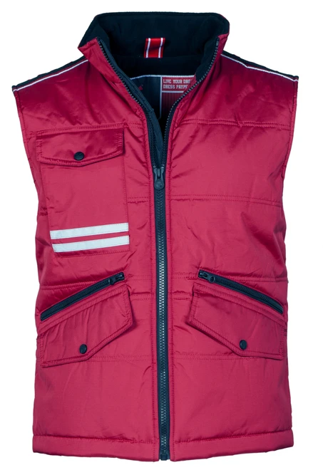 Men’s fitted vest, zip, two LOCK SYSTEM outer pockets, two pockets with zip, slanting pockets for easier access, one smartphone breast pocket and badge holder ring, reflective stripes on the pocket and back; padded, contrasting fleece lining on the back and collar, one inner pocket, zip for easier printing and embroidery