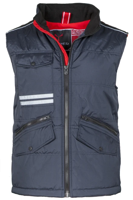 Men’s fitted vest, zip, two LOCK SYSTEM outer pockets, two pockets with zip, slanting pockets for easier access, one smartphone breast pocket and badge holder ring, reflective stripes on the pocket and back; padded, contrasting fleece lining on the back and collar, one inner pocket, zip for easier printing and embroidery