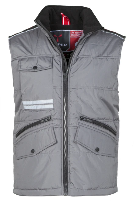 Men’s fitted vest, zip, two LOCK SYSTEM outer pockets, two pockets with zip, slanting pockets for easier access, one smartphone breast pocket and badge holder ring, reflective stripes on the pocket and back; padded, contrasting fleece lining on the back and collar, one inner pocket, zip for easier printing and embroidery