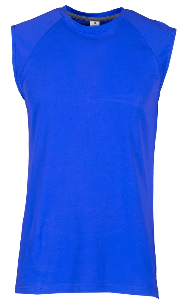 Men’s vest with scoop neck, raglan sleeves, 1.5 cm spandex mix rib neckband with top stitching on the front, contrasting shoulder-to-shoulder reinforcement tape visible on the inside collar, stretch seams, side seams for greater comfort