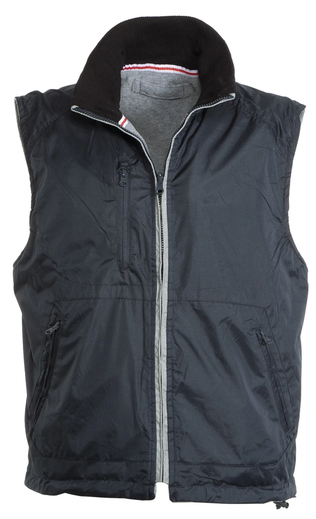 Reversible men’s vest, plastic zip with reflex profile, drawstring waist, three outer pockets. Fleece lining, rib knit inside collar, two breast pockets and chest zip for easier printing and embroidery